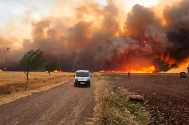 Viranşehir ilçesinde hasat yapan biçerdöverin motor kısmında çıkan yangın, buğday tarlasına sıçradı. Köylüler yangına...